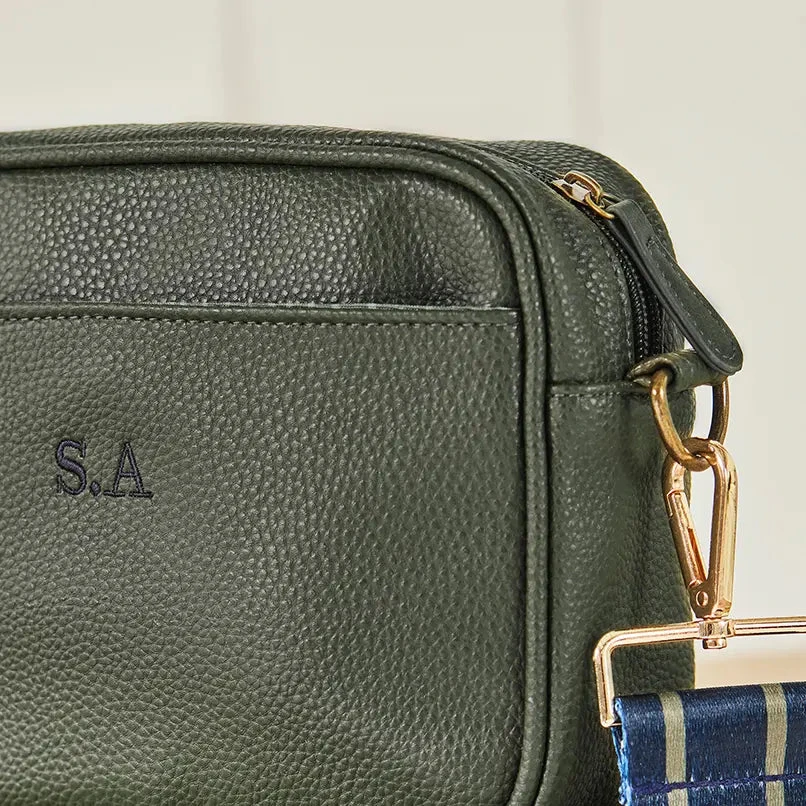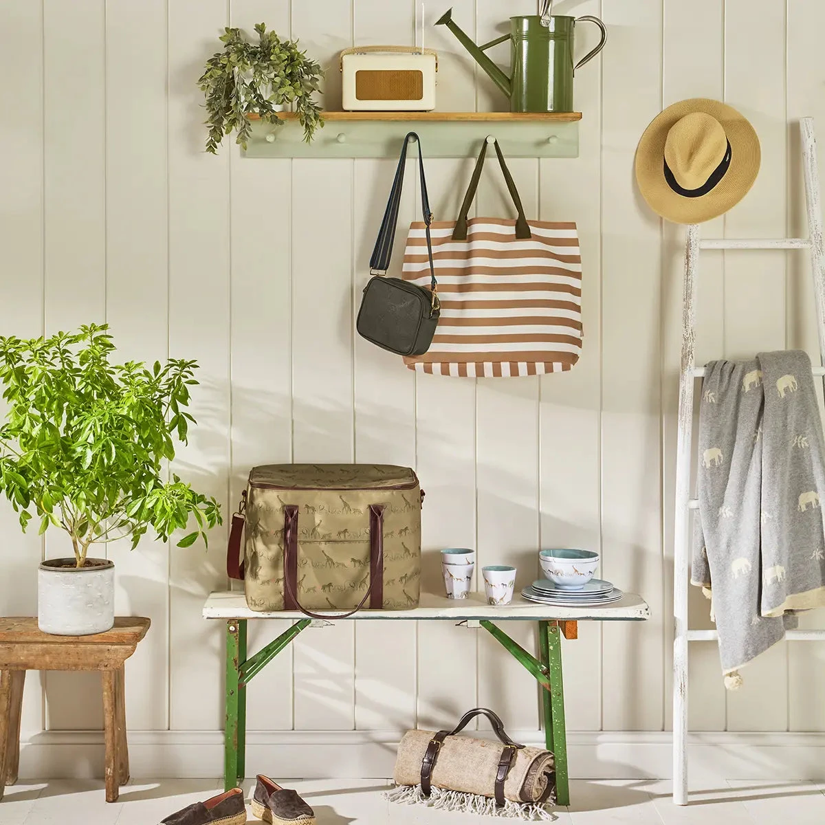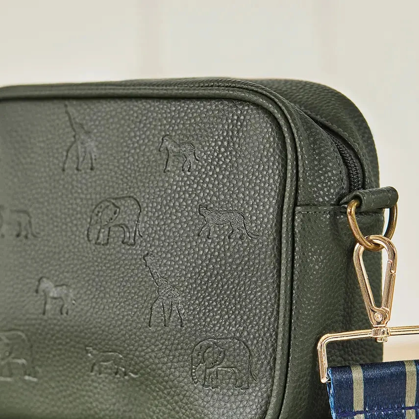 This beautiful khaki green camera bag is perfect for using as an everyday handbag to keep all your essentials in, or simply detach the strap and use as an evening bag. Made from faux leather the camera bag features Sophie’s African animal illustrations embossed on the front with navy and mustard striped detachable straps. It would make a pretty and practical gift idea for any animal enthusiast!