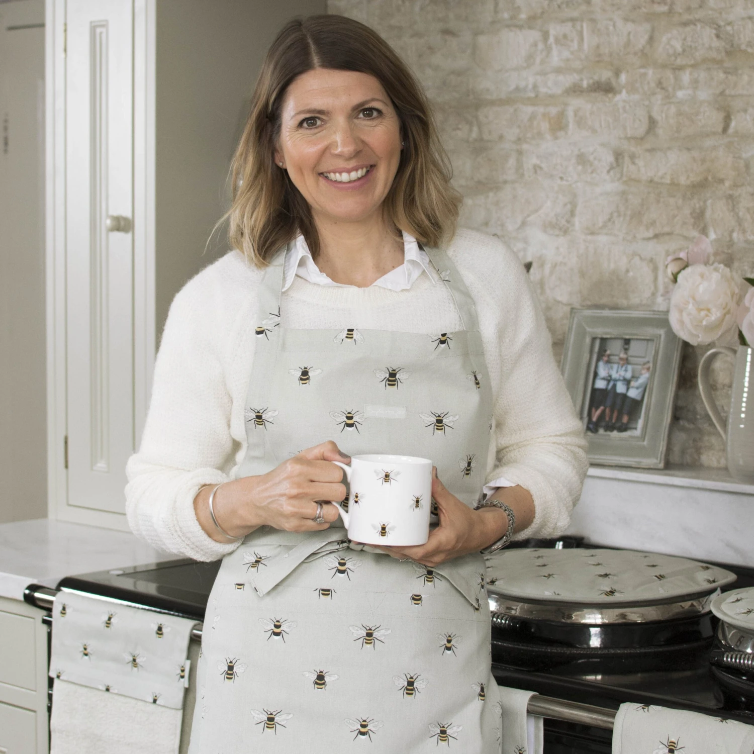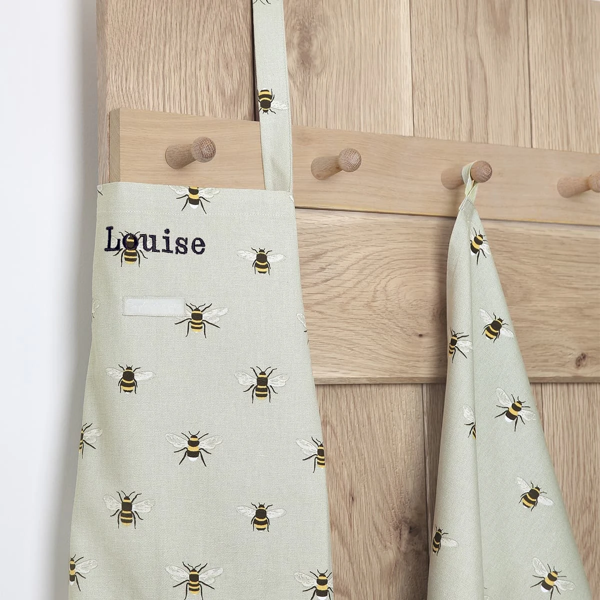 Keep your clothes free from baking mess and protect yourself from cooking spillages with this pretty apron covered in Bees on a pale green background. There is a handy pocket at the front of the apron which is perfect for holding your utensils while you cook.