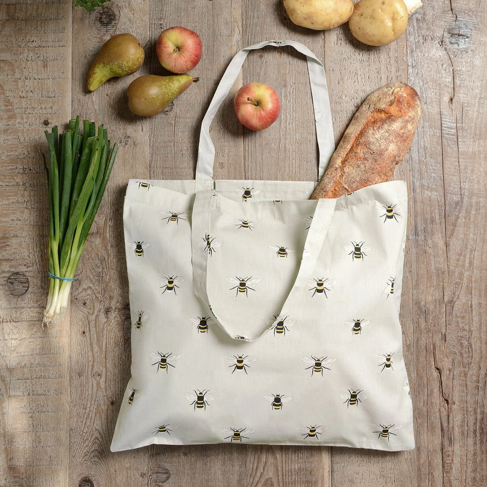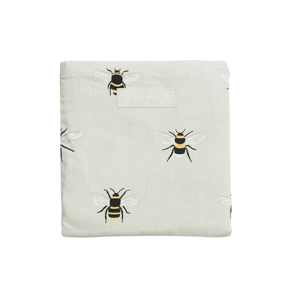 This ingenious shopping bag conveniently folds neatly into the internal pocket and is covered in stylish bees, on a pale green background.Â