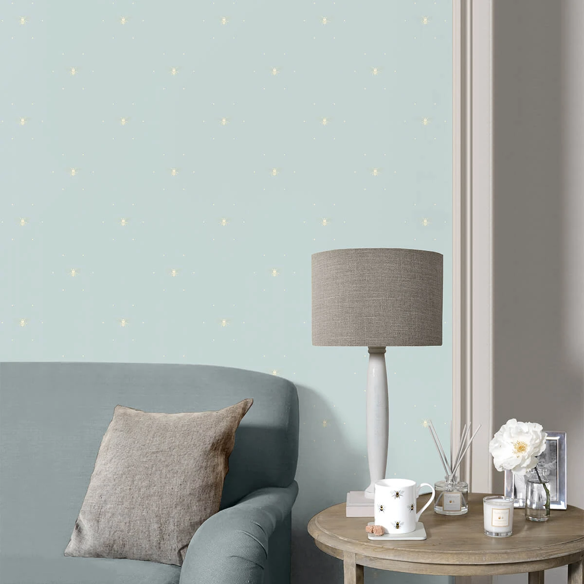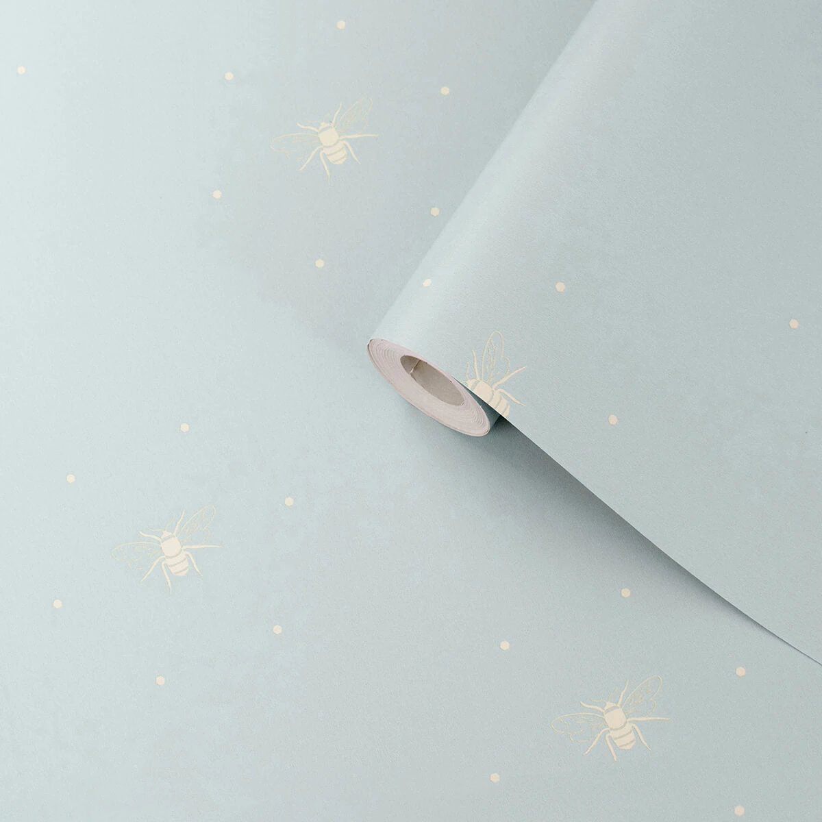 This lovely wallpaper is sure to add a touch of colour to your home, featuring delicate stone coloured bee silhouettes surrounded by six dots on a duck egg background.