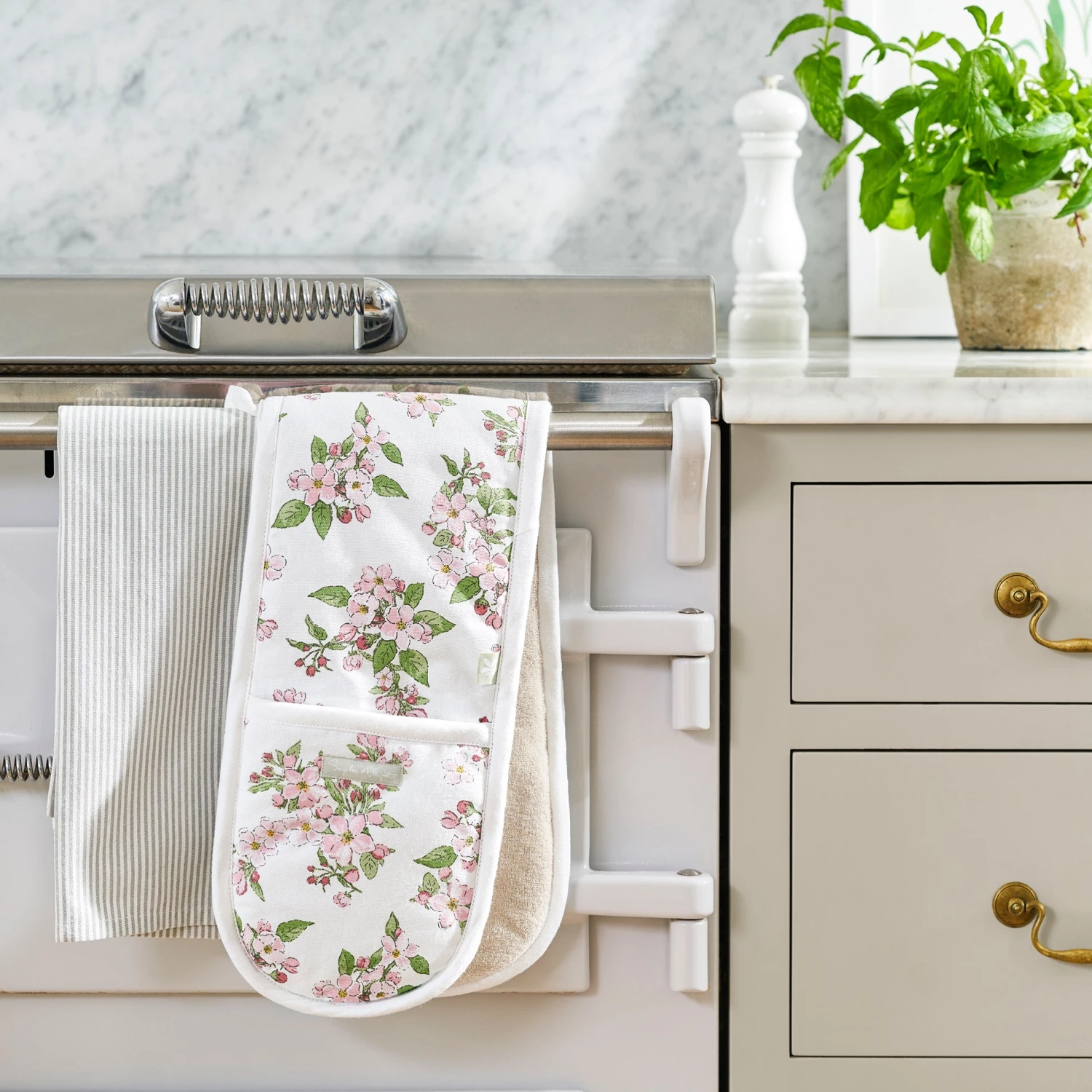 Protect your hands from hot baking trays and cookware with our beautiful Blossom double oven glove. Capturing the natural beauty and freshness of spring florals, Sophie’s hand painted print features soft pink and green tones for a modern take on traditional florals. Perfect for adding a new season look to your kitchen.