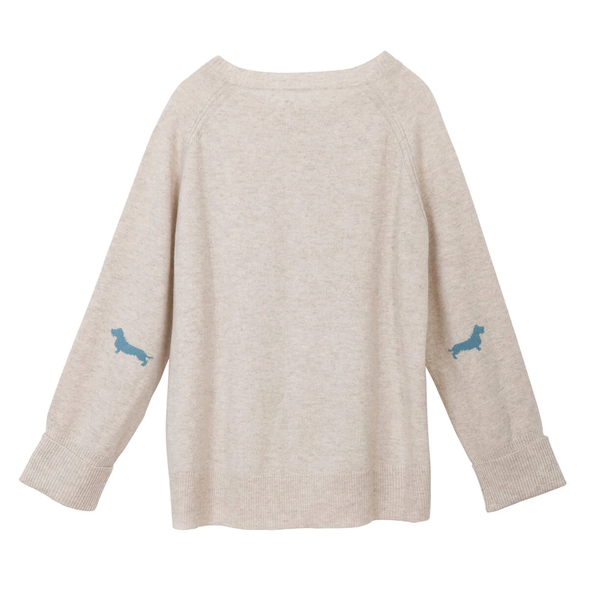 A luxuriously soft cashmere jumper that pairs excellently with any outfit. Style with your favourite jeans and boots for a casual weekend look, or curl up indoors and enjoy the cosiness. Made from 100% cashmere, this oatmeal jumper features adorable dachshund silhouettes on each elbow, has a ribbed hem and rolled up rib cuffed sleeves for extra comfort. It makes a thoughtful and loving gift idea for any Dachshund lover.