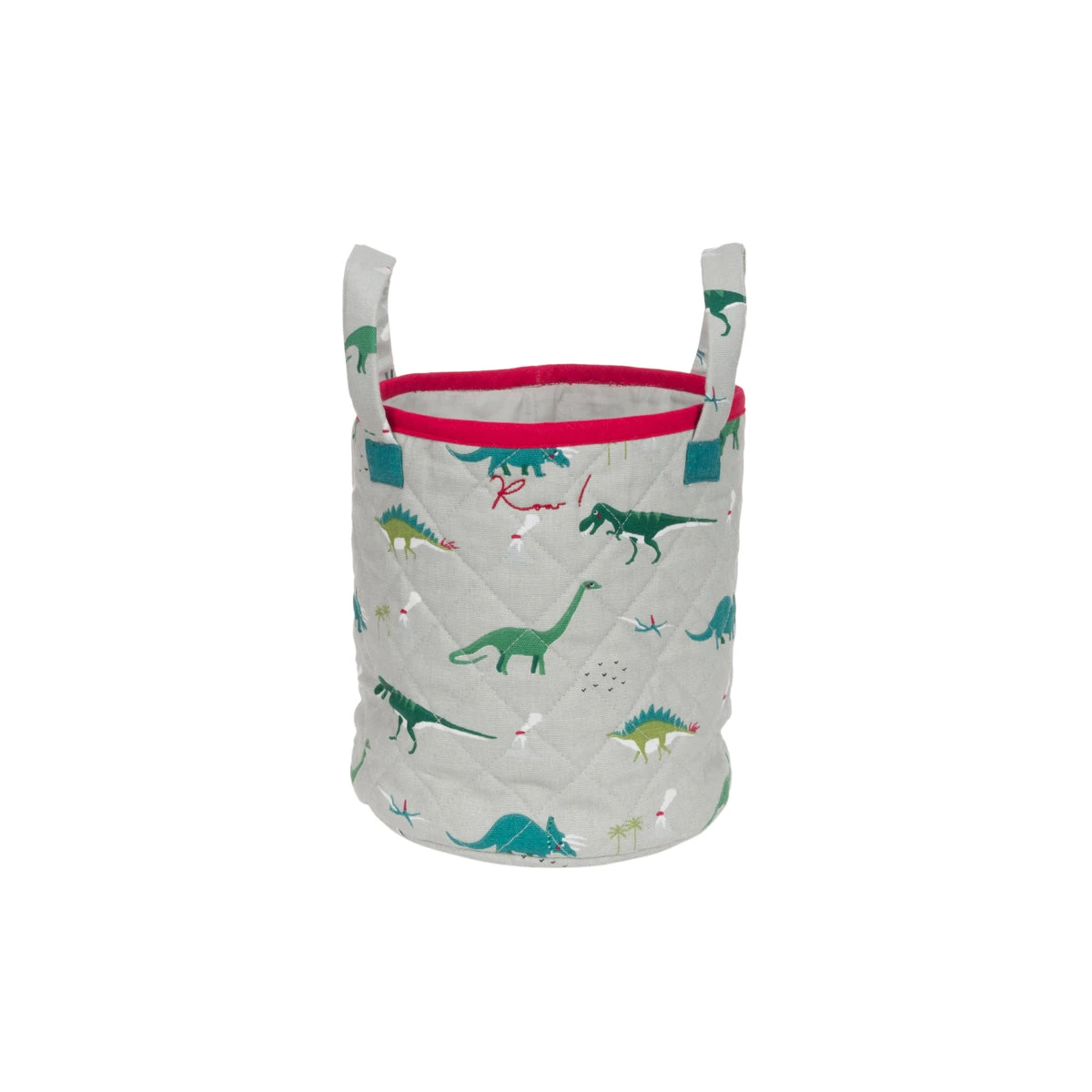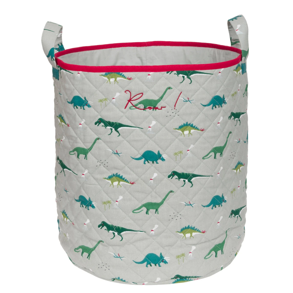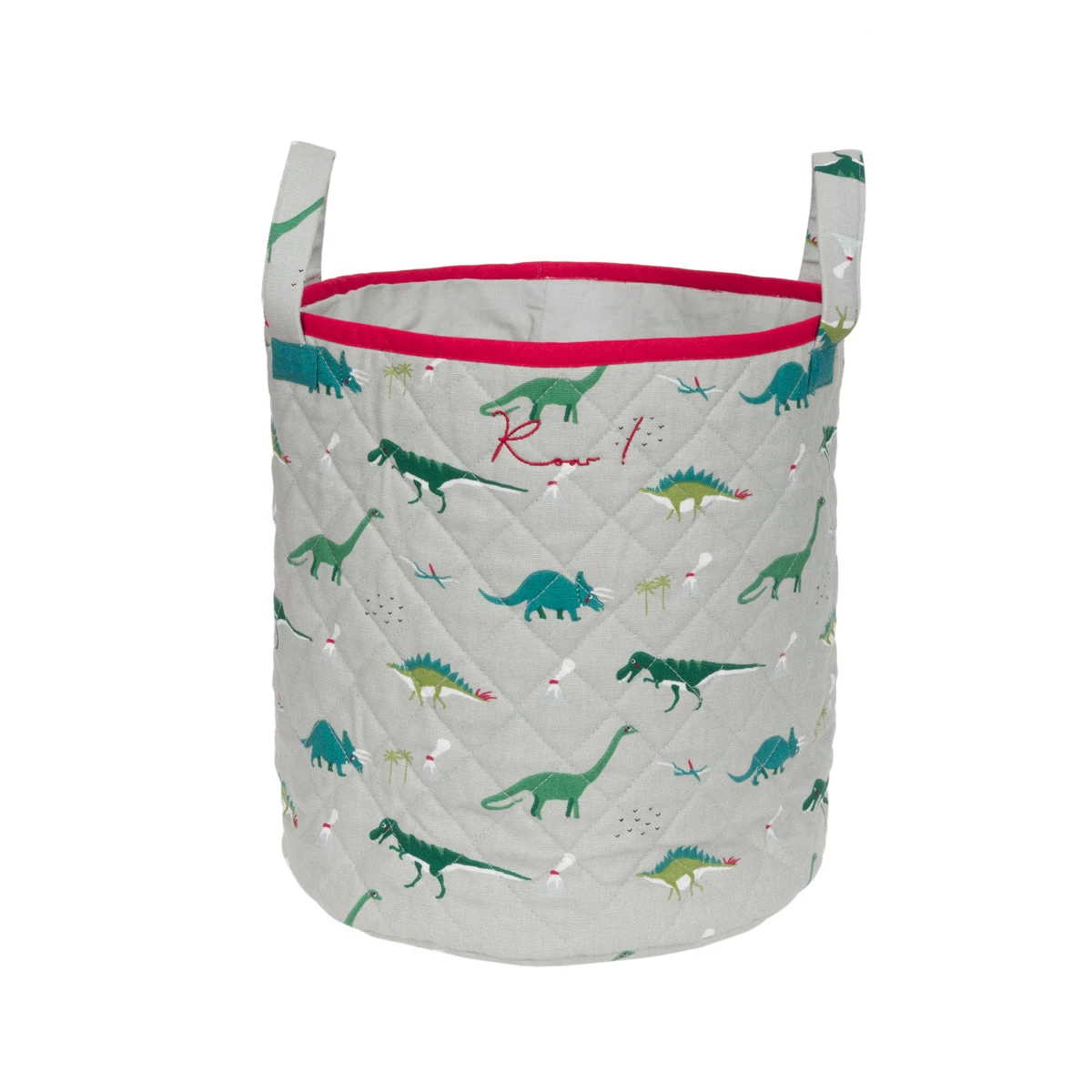 Make tidying up your children’s toys easier with this lovely dinosaurs quilted storage basket, featuring the Diplodocus, Stegosaurus, Triceratops, flying Pterodactyls and the famous T-Rex! Available in three sizes and features the words ‘Roar!‘ embroidered in Sophie’s signature handwriting. Makes an excellent toy basket, kids laundry basket and storage basket for kids.Â