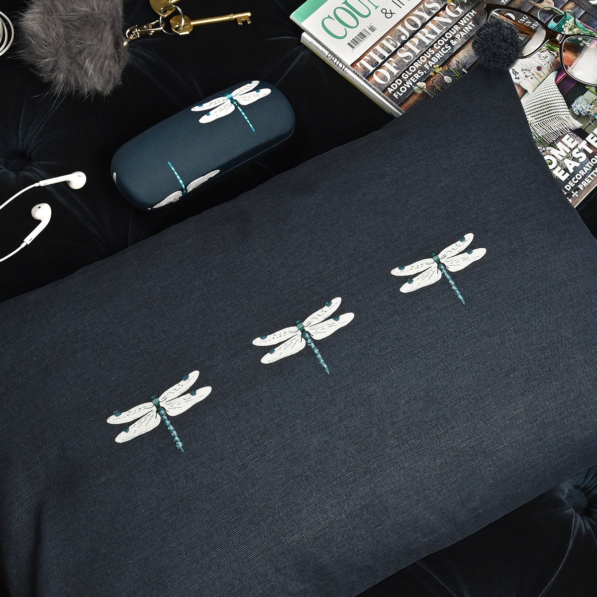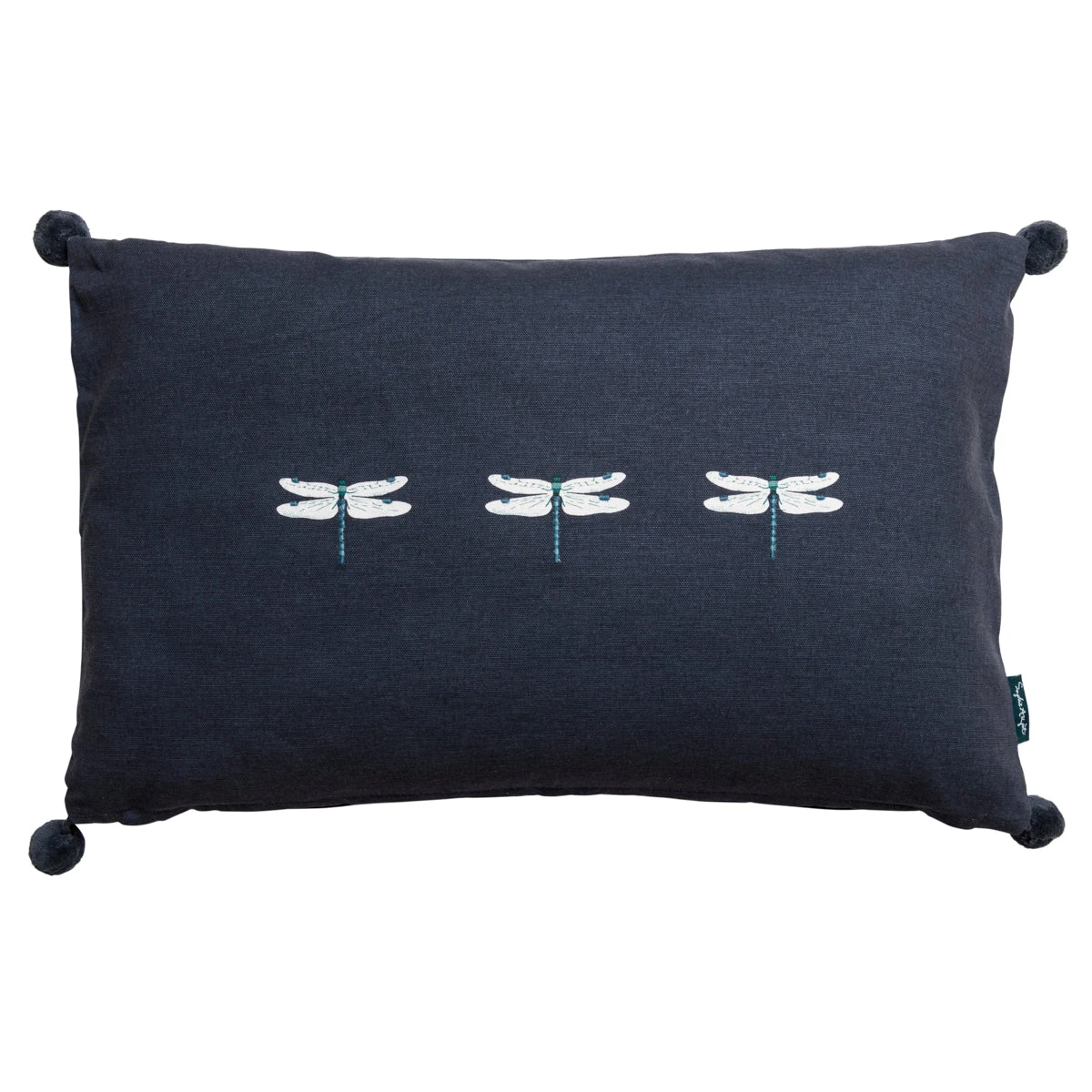 Three striking embroidered dragonflies sit centrally against the contrasting midnight blue background, on this stylish decorative cushion. It’ll look lovely in a sitting room or bedroom and is finished with small pompom corner detailing.