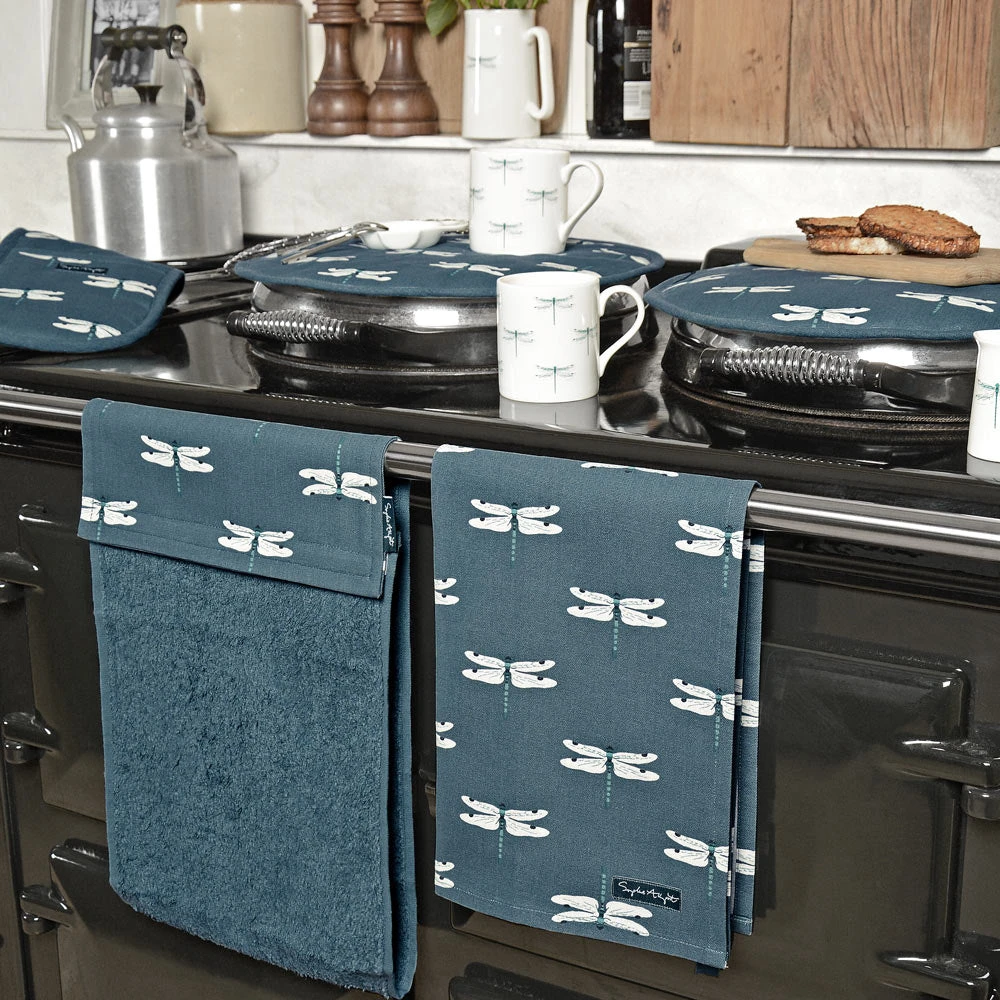 Inspired by the dragonflies in Sophie’s garden, this striking tea towel features their slender bodies and narrow pairs of delicate wings. Which contrasts beautifully against the contemporary midnight blue background. There is a handy ‘loop’ in the top left corner of the tea towel, so you can hang it up in your kitchen.