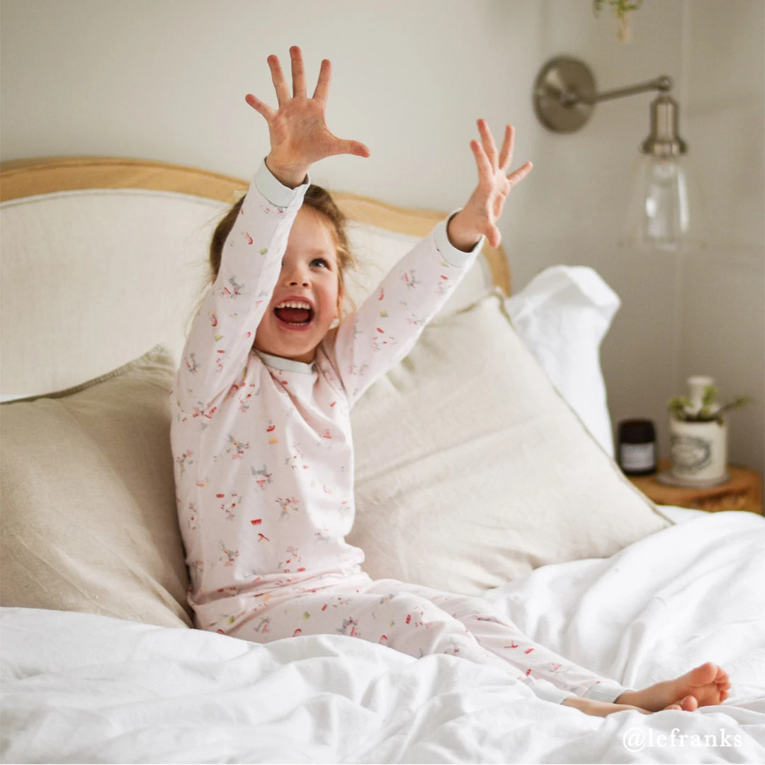 A sweet pink set of kids pyjamas covered in fairground ponies and energetic circus acrobats. A fun design which is available in four sizes from ages 2 to 6. Make bedtime better, made from 100% cotton this cosy set includes a long-sleeved top and matching bottoms.Â