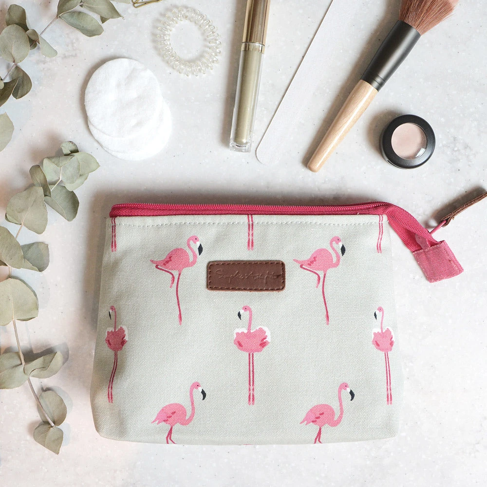 A beautiful zipped makeup bag made from our fun flamingo canvas fabric. Covered in pink flamingos on a chalk grey background.