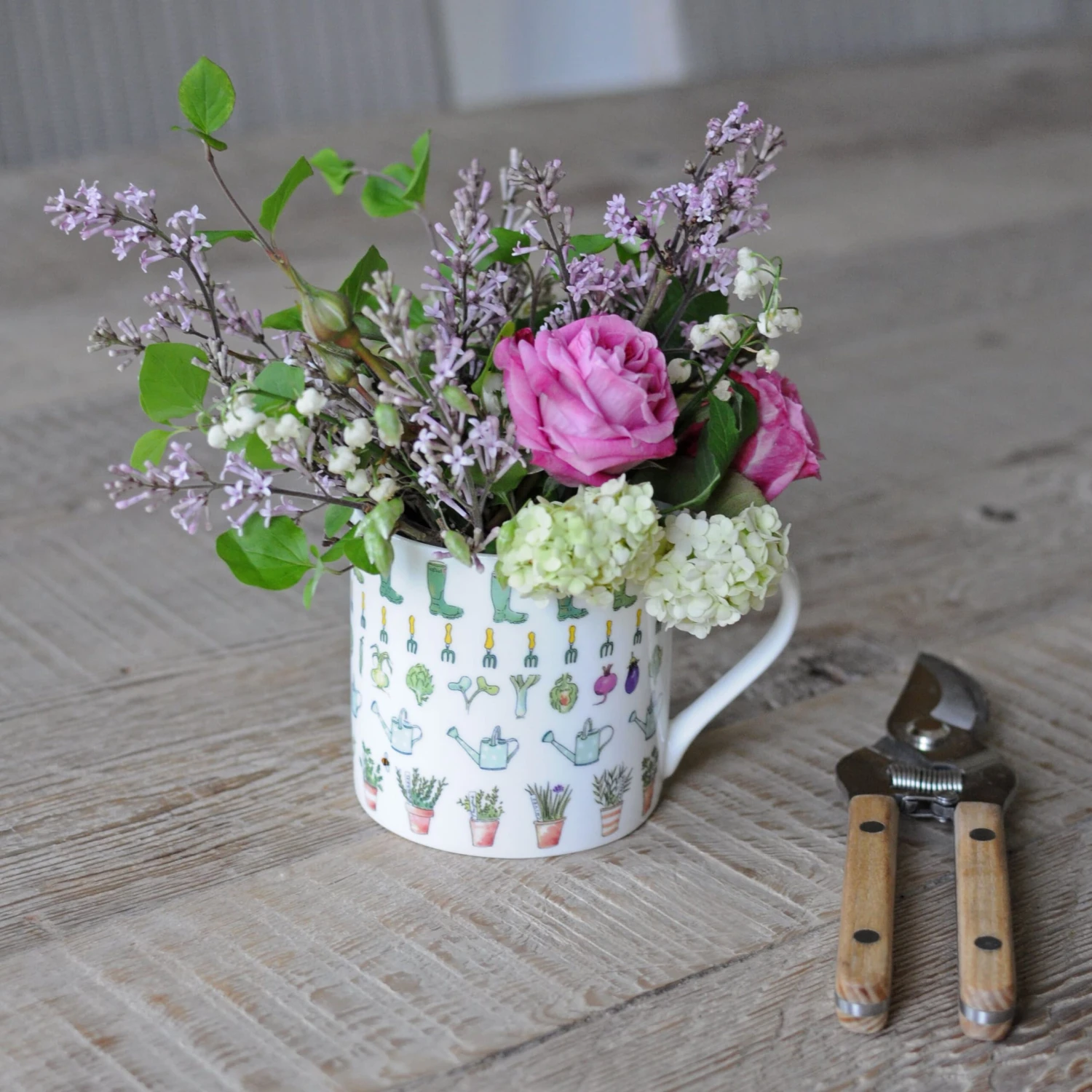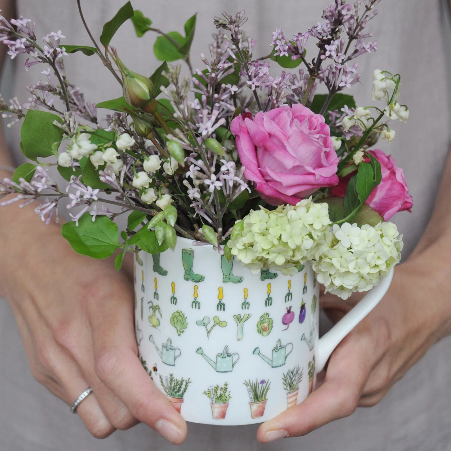 Our lovely ‘Green Fingers’ fine bone china mug will appeal to any gardening enthusiast! It features Sophie’s illustrations of wellington boots, trowels, vegetables, watering cans and herbs. Have a break from some hard gardening and treat yourself to a well deserved cup of tea or coffee. It would make a lovely gift for any green fingered friend.