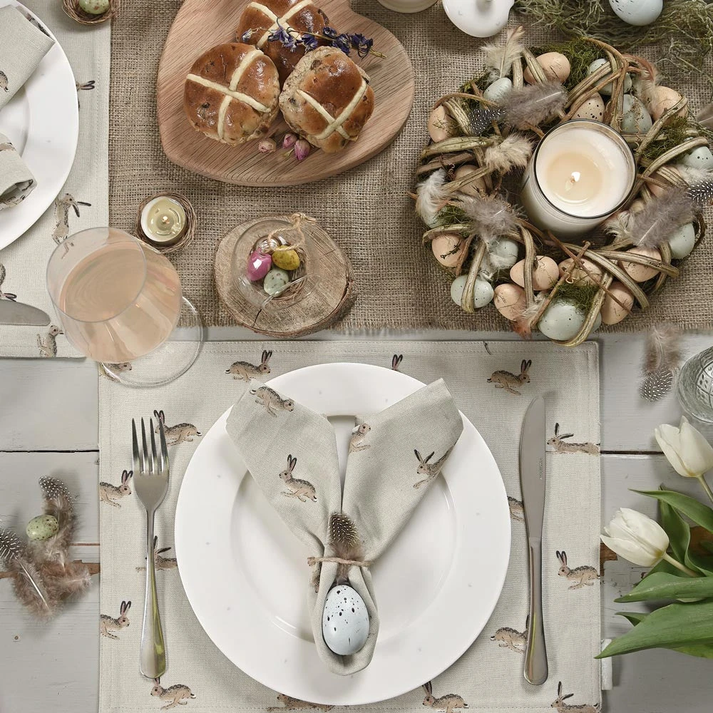 These lovely cotton napkins come in a set of four and are covered in Hares racing over a stone coloured background. A lovely addition to any country kitchen, the Napkins are 41cm x 41cm and made from durable cotton. Bound to brighten up everyday kitchen dining or smarten up a dinner party table setting.Why not consider some matching Hare Placemats or Table Runner to really impress your dinner guests with a beautiful co-ordinated look – indoors or outdoors.