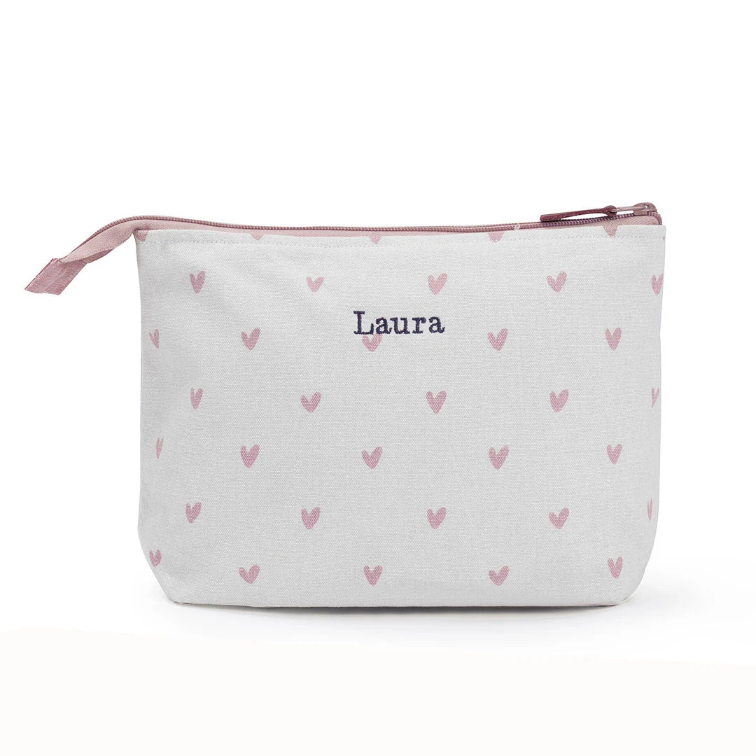 A beautiful zipped wash bag made from our Hearts canvas fabric (giving the product a good structure without that plastic feel). The makeup bag measures approximately 27.7 x 20.8cm and has a flat base allowing it to sit upright.