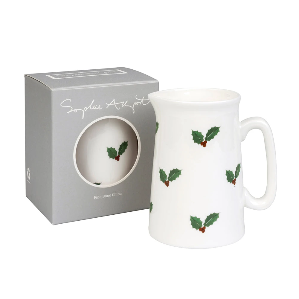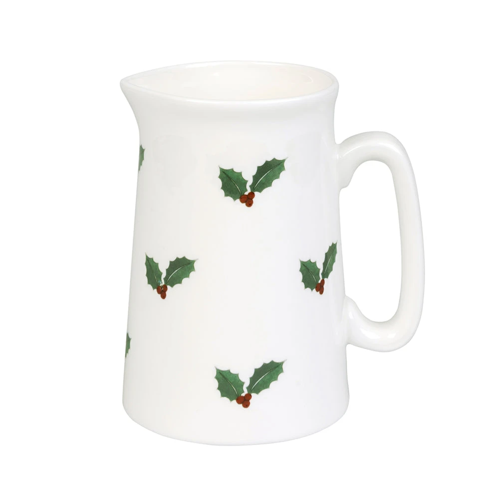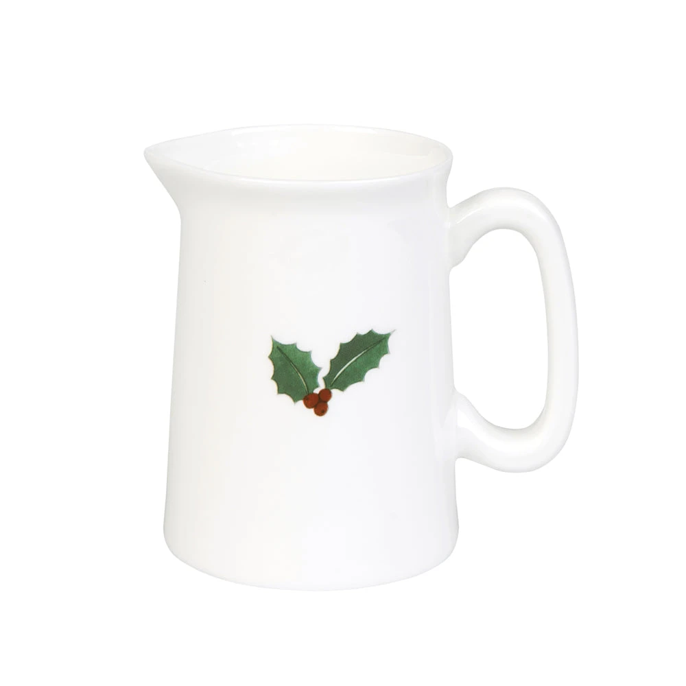 A white fine bone china jug, featuring festive holly and vibrant berries. There are a variety of sizes available – perfect for everything from a drop of cream with your coffee or a jug of custard for your Christmas pudding!