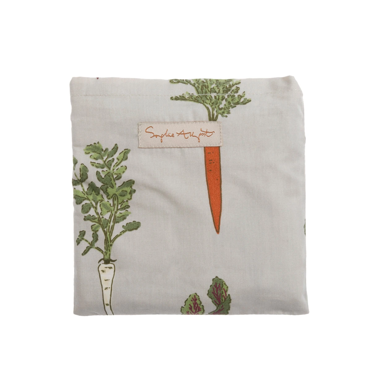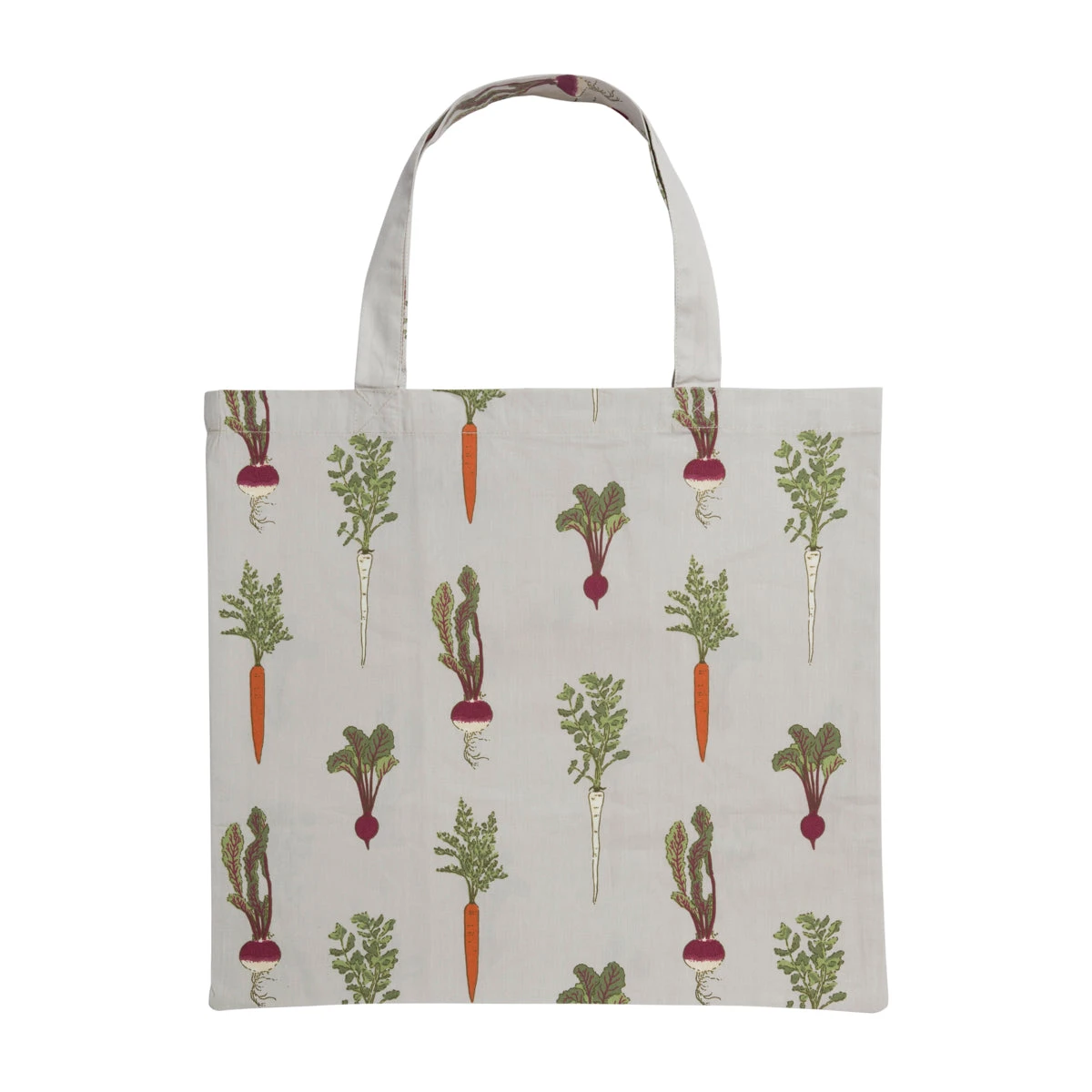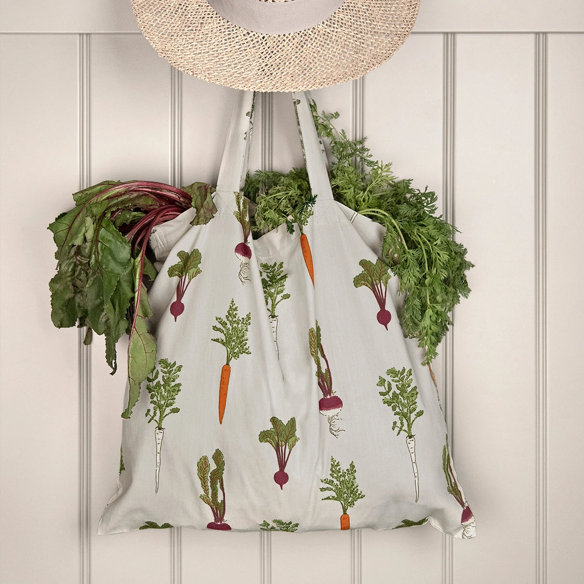 This shopping bag folds down to 15 x 15cm and is perfect for keeping in your handbag or car for those unexpected shopping trips. Made from 100% cotton, this lovely bag features some of our favourite seasonal vegetables including carrots, parsnips, beetroot and turnips on a pale linen coloured background.