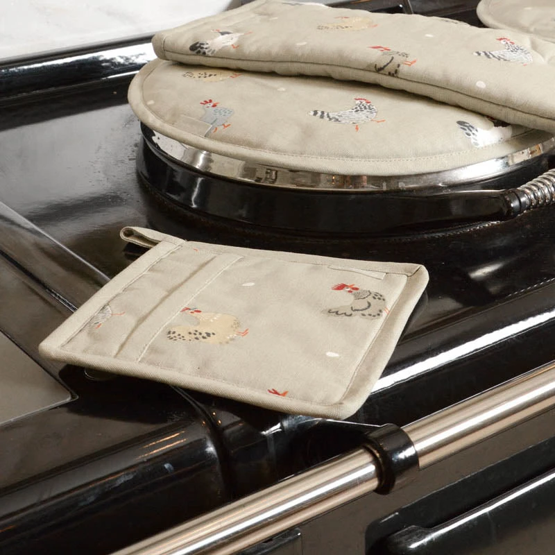 A brilliantly useful kitchen accessory, this pot grab will protect your hands while lifting hot pans and dishes. Made from 100% cotton, it is hard wearing and the internal padding gives you excellent insulation. Covered in Sophie’s illustrations of different hens on an oat stone coloured background.