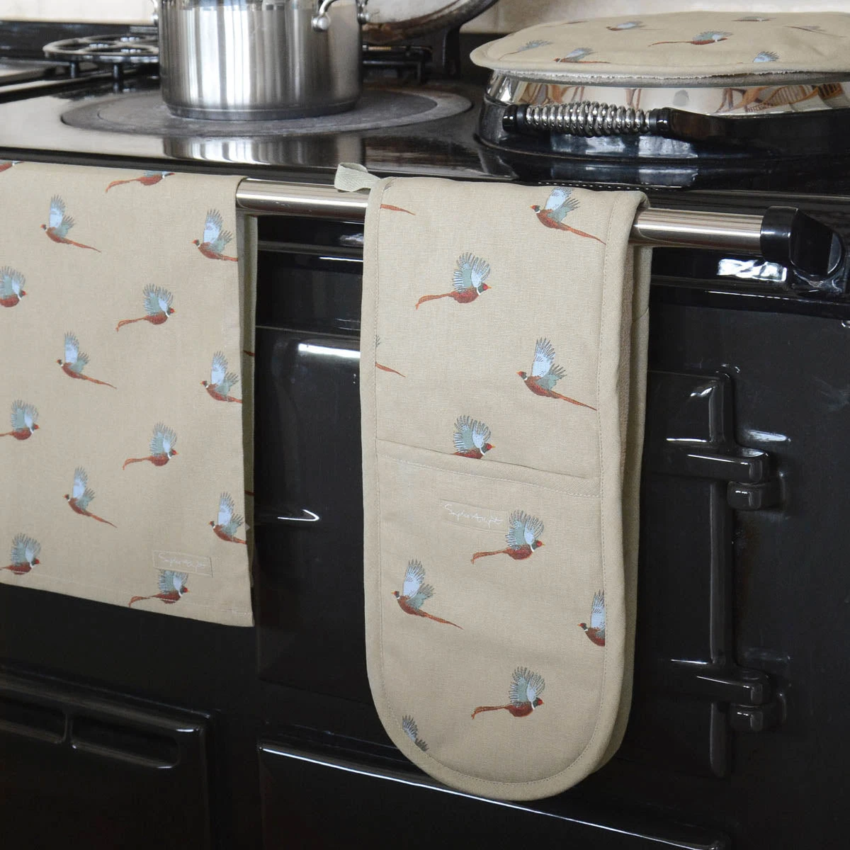Protect your hands from hot pans with this lovely Pheasant double oven glove. The design features the magnificent long-tailed male Pheasant game bird flying across a stone green background. Sophie has captured the distinctive rich chestnut, golden-brown and black markings on the body and tail, with a dark green head, red face wattling and white ring around the neck. A practical gift for getting those piping hot casseroles out of the oven and great for any country kitchen or anyone who collects our Pheasant range. The reverse of the glove and inside each hand pocket has a polyester thermal layer for extra protection and there is also a handy ‘loop’ in the middle of the glove, so you can hang it up in your kitchen.