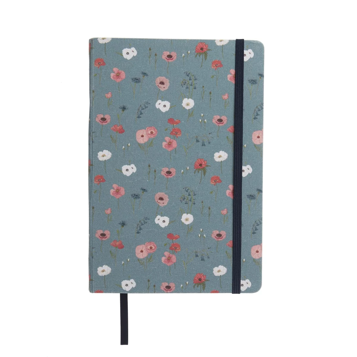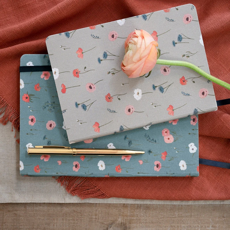 This beautiful floral A5 notebook features blossoming red, pink and white poppies, delicate British bluebells, cornflowers, and an abundance of buds ready to burst on a grey blue ground. This fabric notebook is great for taking down notes and would make an excellent gift for flower lovers and it even has a ribbon page marker and elastic closure.
