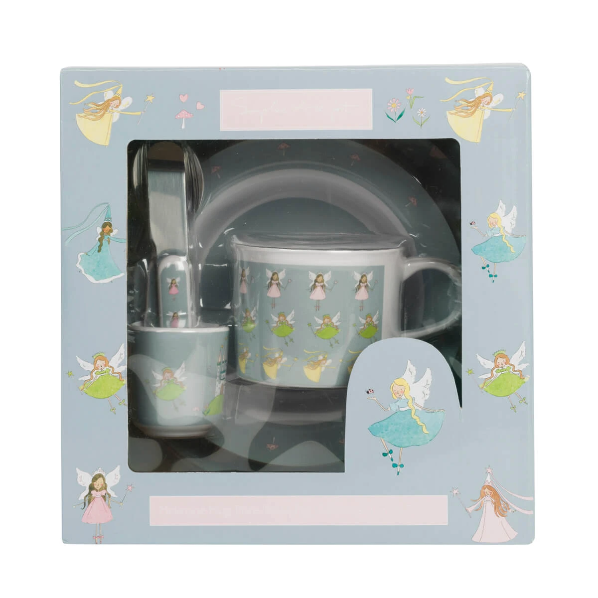 This magical Princess Fairies themed seven-piece dining set includes a plate, bowl, cup, knife, fork, spoon and egg cup. It makes a lovely little set for children’s mealtimes or gift idea for birthdays. Featuring lots of enchanting princess fairies on a pale lilac duck egg coloured ground.