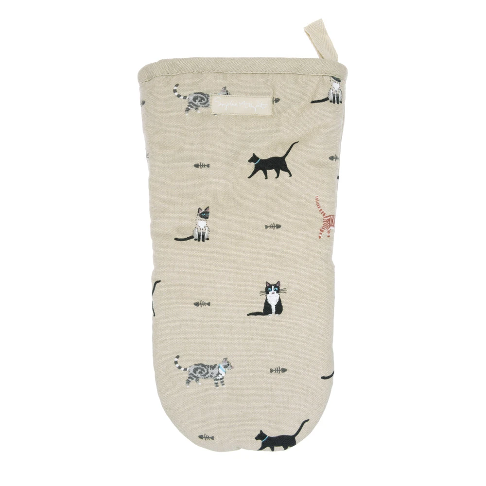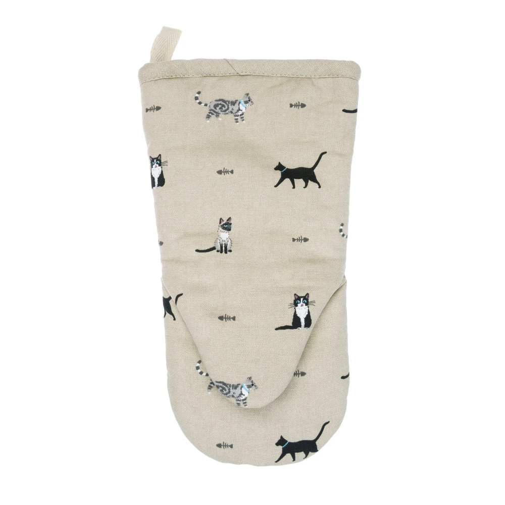 Covered in ginger, black & white, Siamese, tabby and black cats on a neutral wheat beige background, this oven mitt is ‘purrfect’ for the kitchen of a feline fanatic.