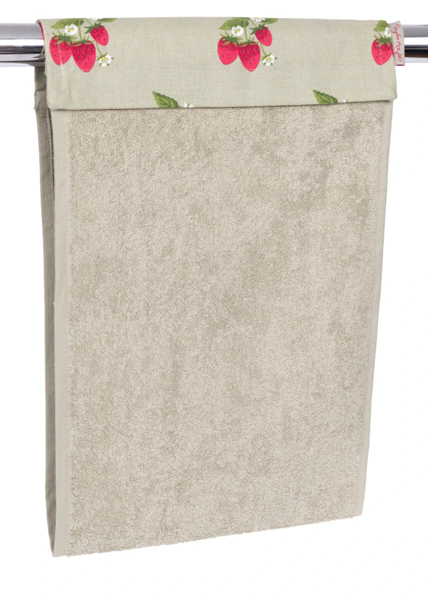Keep your hands dry with this super stylish roller hand towel, featuring Sophie’s bunches of juicy red strawberries on a green neutral ground. Designed to sit on your cooker rail, this roller hand towel has a velcro fastening so it won’t slip off.Â