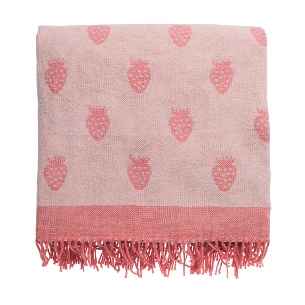 Make picnic and beach trip memories sweeter with this practical and stylish picnic blanket from our Strawberries collection. Featuring Sophie’s strawberries silhouettes on a blush pink ground colour, it is perfect for family days out or taking a snooze in the sun. The faux leather straps make it easy to carry around, whilst the water-resistant backing is perfect for keeping you dry if the ground is wet.Â