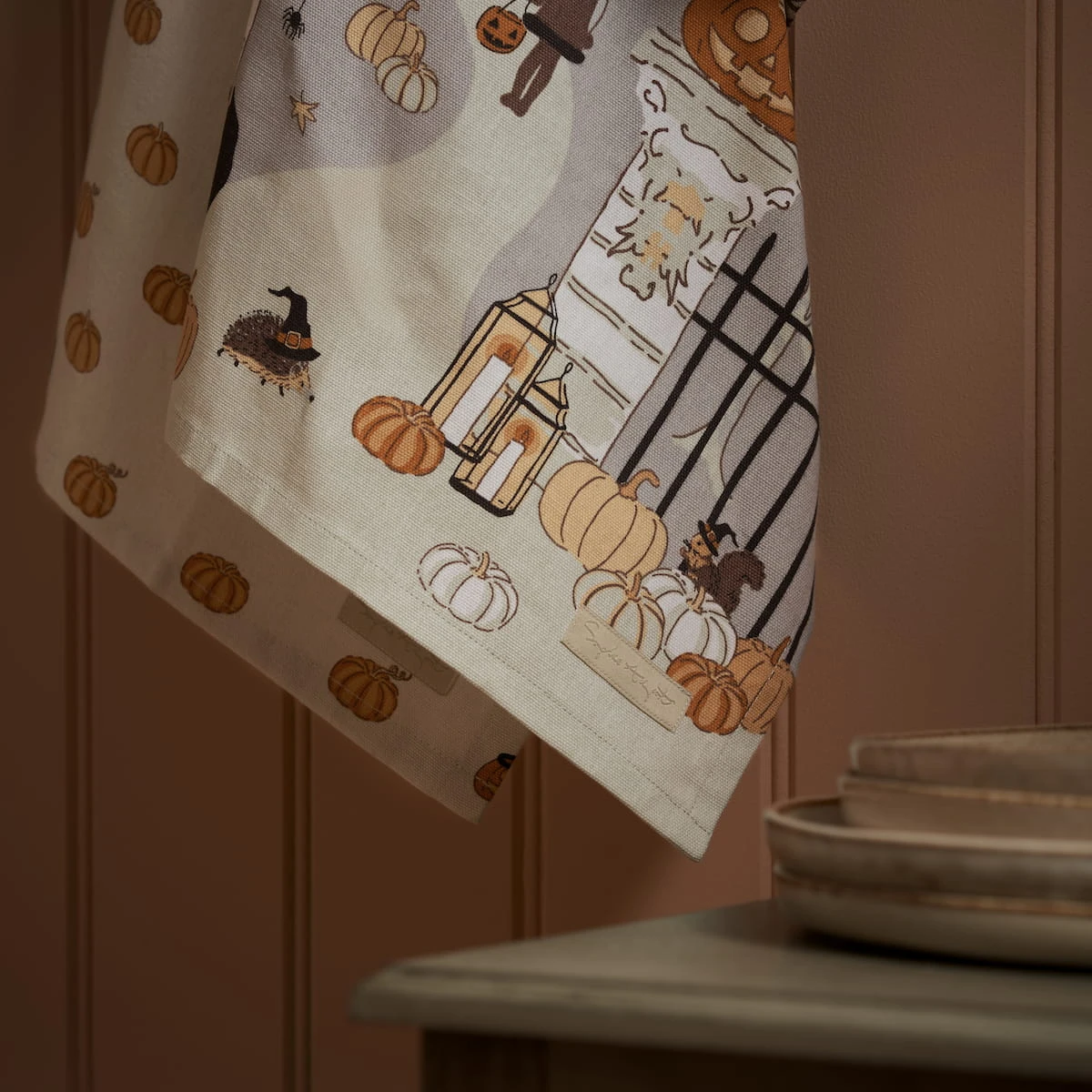 Bring the nostalgic excitement of Halloween to your kitchen with our Trick or Treat scene tea towel. This 100% cotton tea towel features trick-or-treaters knocking on doors, surrounded by Jack-o’-lanterns, bats, spiders, and superstitious black cats, whilst autumn leaves fall from the seasonal trees. Perfect for evoking those dusky autumnal evenings, this iconic print will delight children and adults alike. There is a handy ‘loop’ on each top left corner, so you can hang up the tea towel in your kitchen.