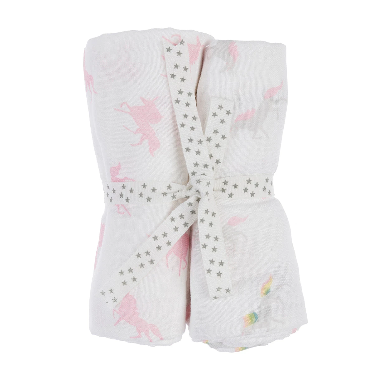 The ideal gift for a baby shower, this set of two soft unicorn print muslins are 100% cotton and are wrapped in white ribbon with tiny gold stars.