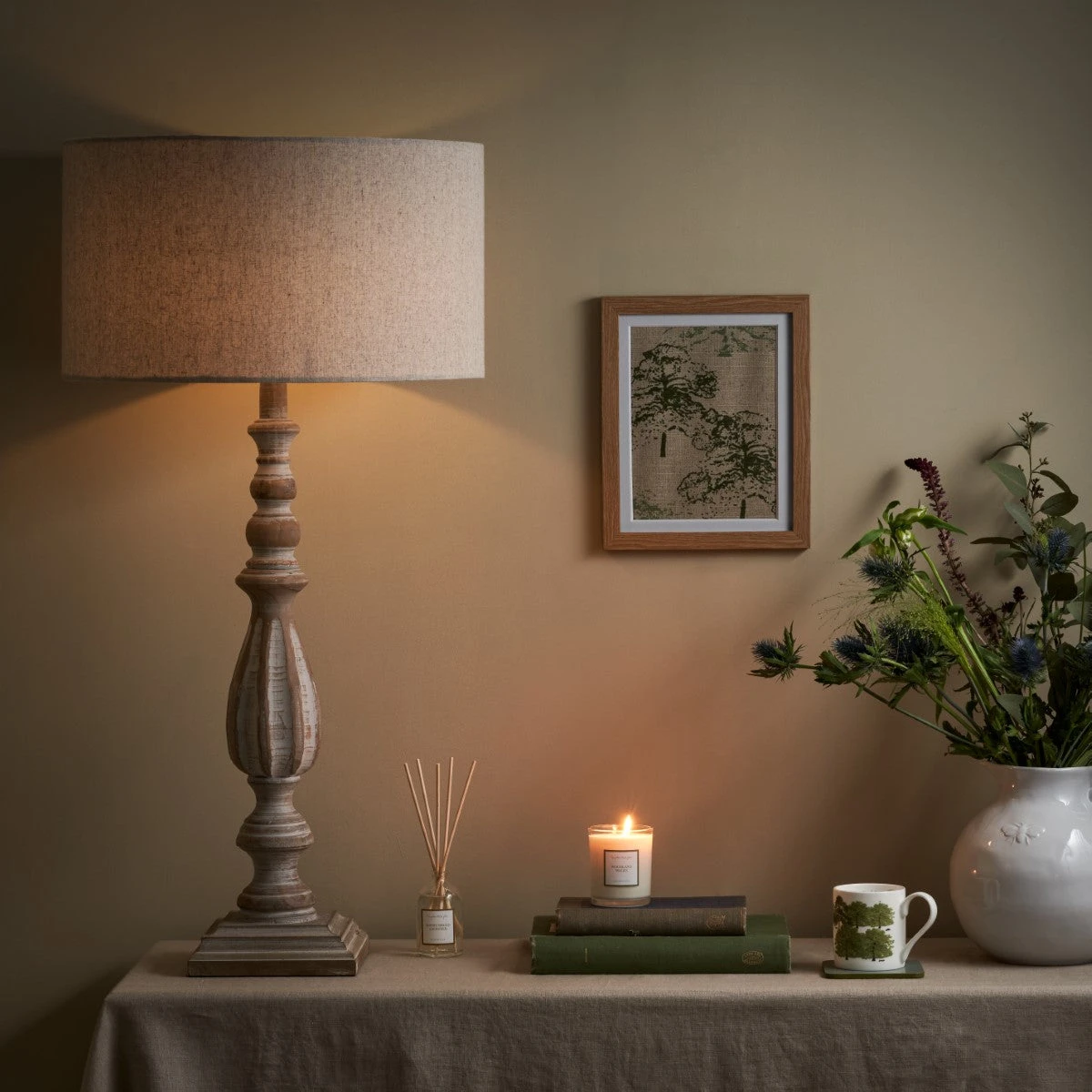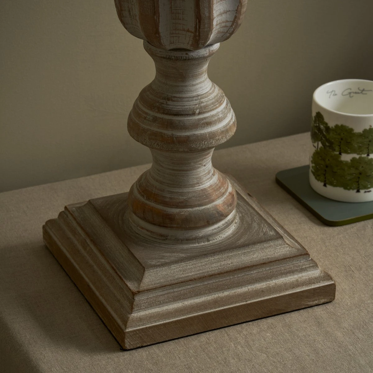 Drawing inspiration from the form of antique candlesticks, this Witham Carved Table Lamp boasts a beautifully carved vintage style turned base with a subtle whitewash finish, complimented by a taupe linen blend shade. Offering an understated elegant lighting solution, the lamp exhibits rustic charm and is the perfect choice to position on your bedside table, console table or by your favourite chair for a cosy reading nook.